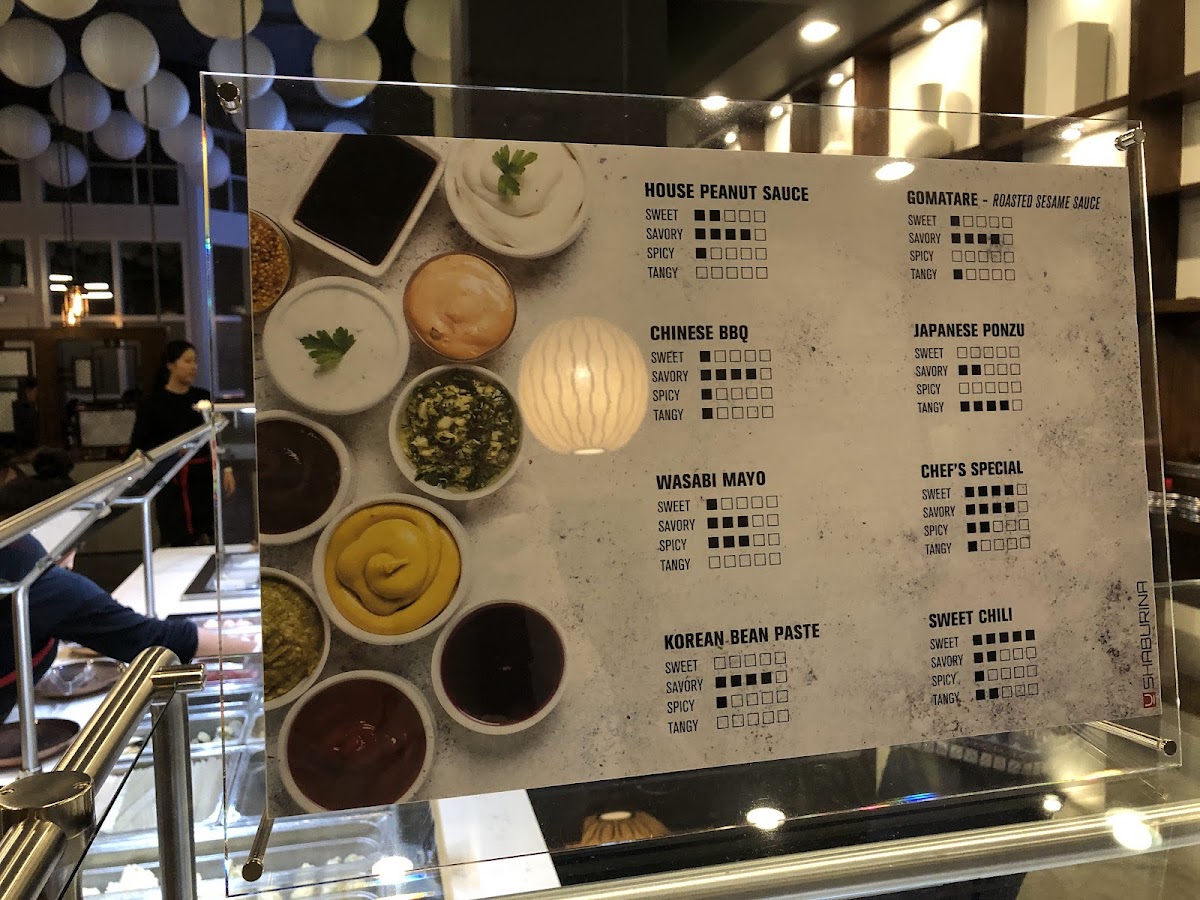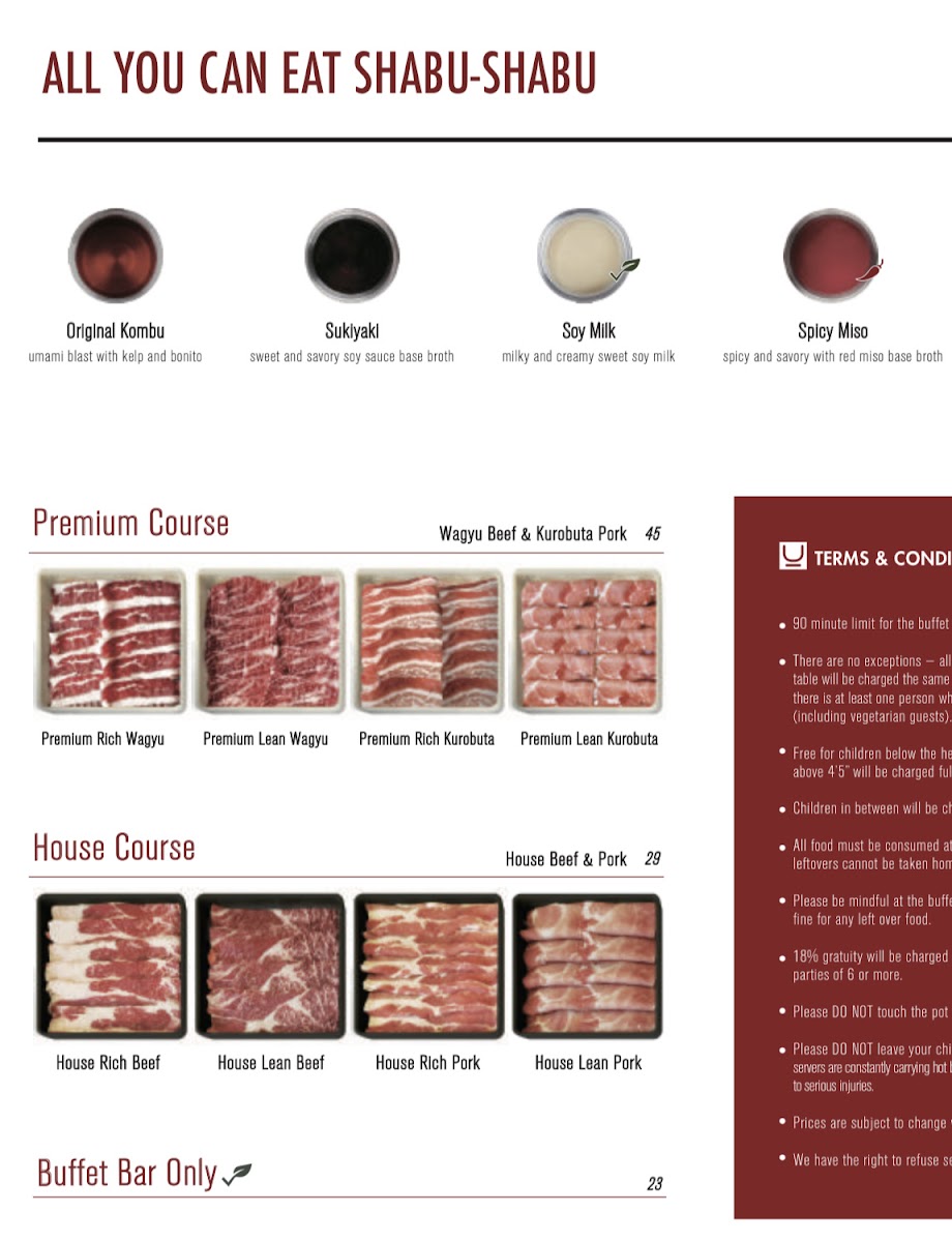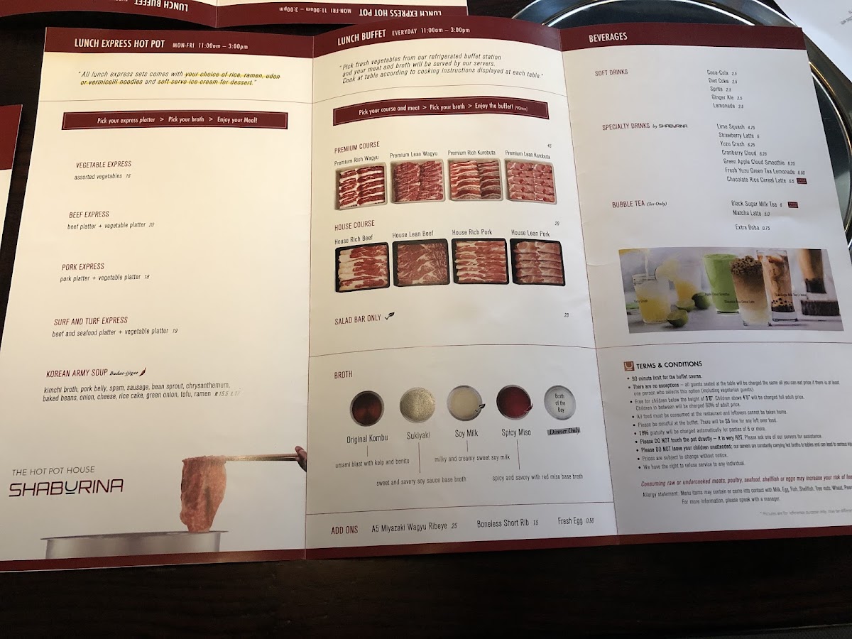 The menu at SHABURINA SHABU-SHABU HOT POT offers a variety of Japanese and Korean-style hot pot dishes, with options suitable for both casual dining and buffet-style meals. The primary focus is on shabu-shabu and sukiyaki hot pot selections featuring premium meats such as Boneless Shortribs and A5 Miyazaki Wagyu. Guests can customize their hot pot experience by choosing from several broth flavors including Hokkaido Miso, Spicy Miso, Sukiyaki, Mala, and Original Kombu.